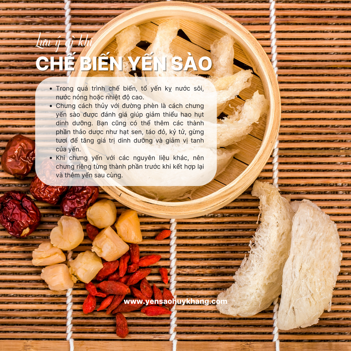 - Trong quá trình chế biến, tổ yến kỵ nước sôi, nước nóng hoặc nhiệt độ cao. Để giữ được dinh dưỡng tốt nhất của tổ yến, cách chưng yến sào được đánh giá giúp giảm thiểu hao hụt dinh dưỡng, đặc biệt là chưng cách thủy với đường phèn. Bạn cũng có thể thêm các thành phần thảo dược như hạt sen, táo đỏ, kỷ tử, gừng tươi để tăng giá trị dinh dưỡng và giảm vị tanh của yến.